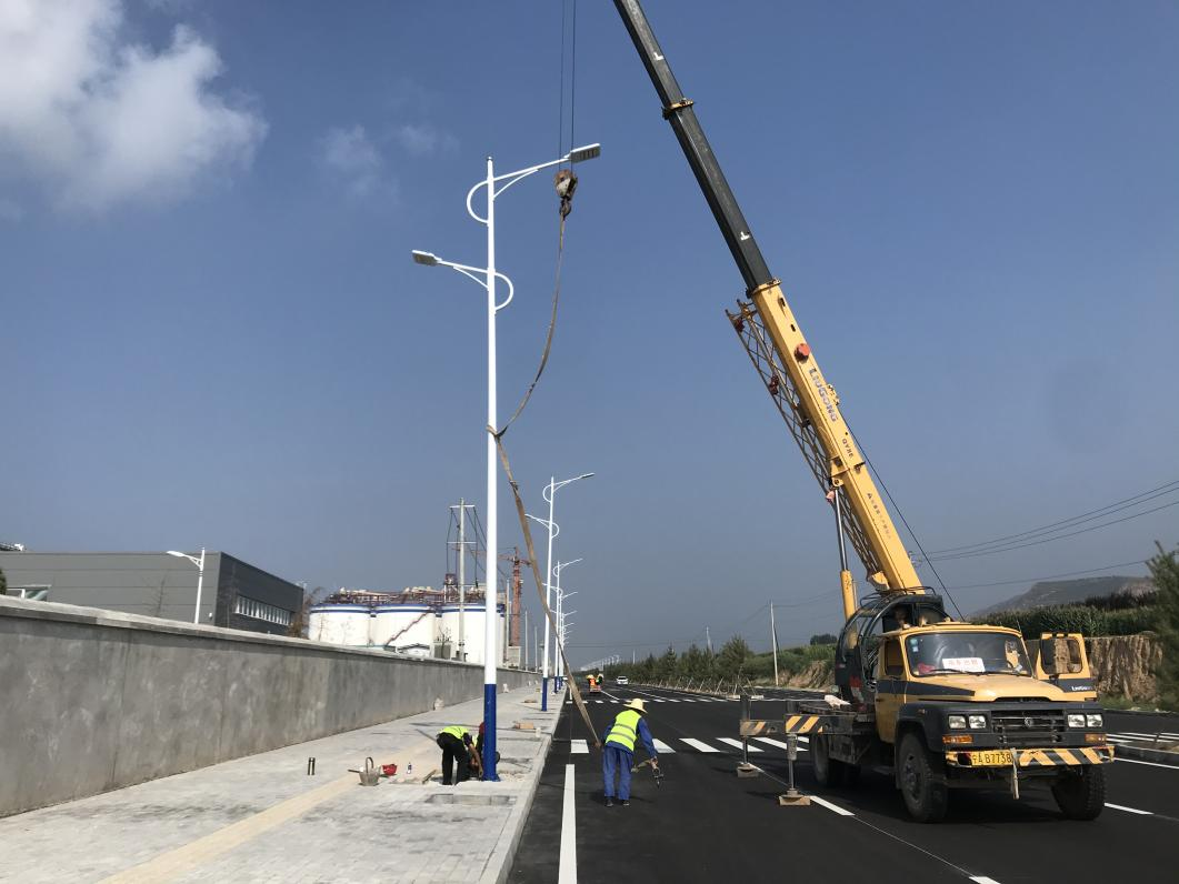 2022-08-11为了使平凉工业园区北大路(汽修路-泓源东路段)照明工程按期交付使用,宜浩园林公司增加施工人员,加大施工设备投入,不惧连日高温天气,加班加点的进行基础浇筑、灯头安装及路灯吊装等工作,力争早日完成安装,达到运行条件。项目由宜浩园林公司负责实施,道路全长2